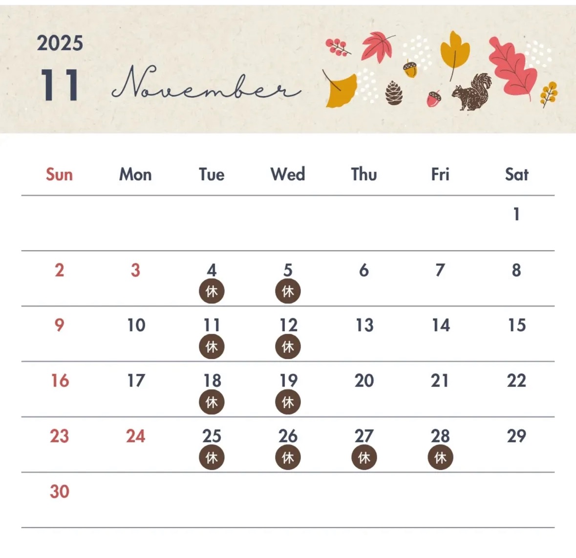 11月は毎週火曜日と水曜日、25日から28日まで休業とさせていただきます