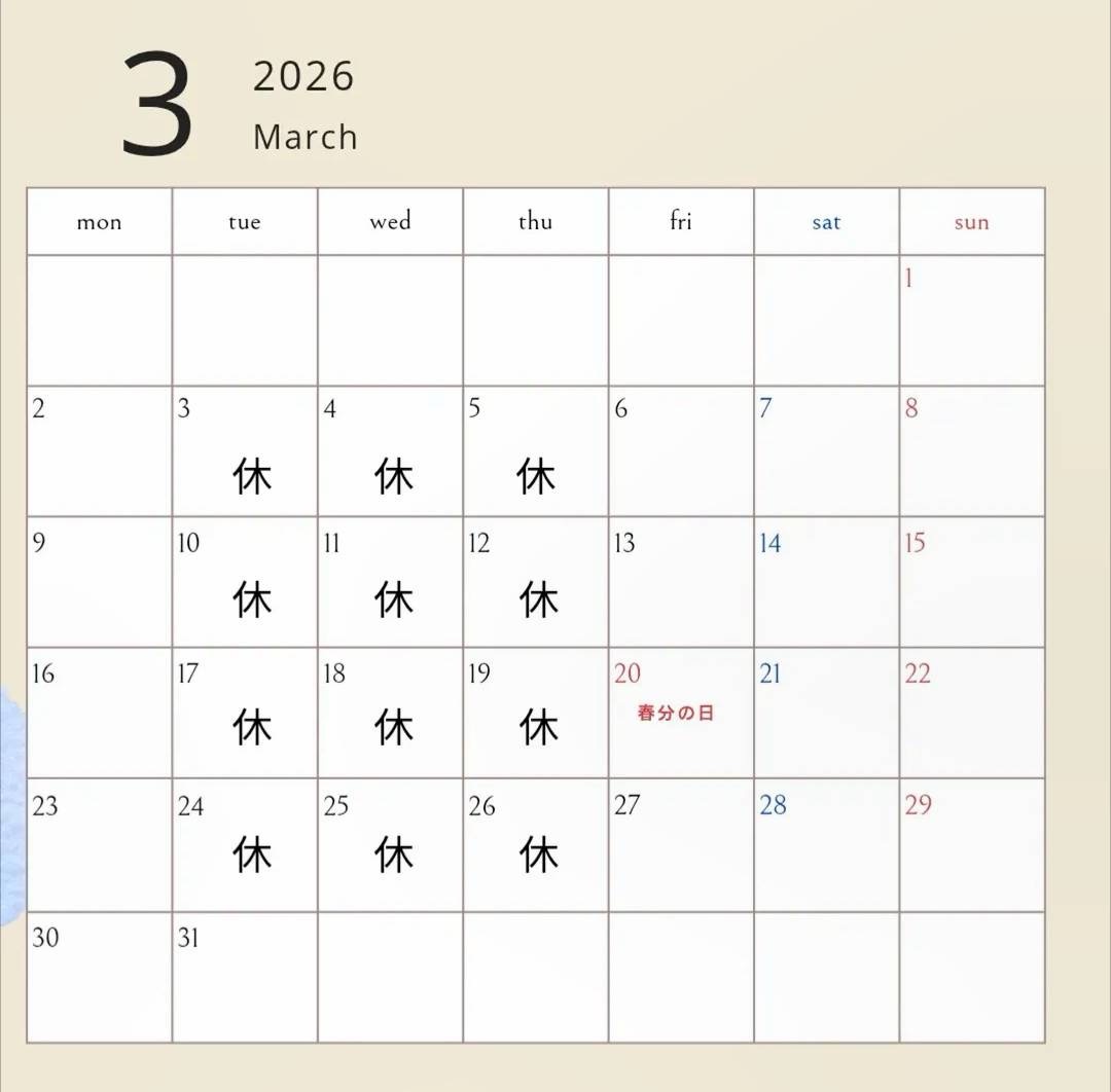 月岡店は3月中も通常の[火曜日、水曜日〕に加えて[木曜日〕もお休みさせていただきます。